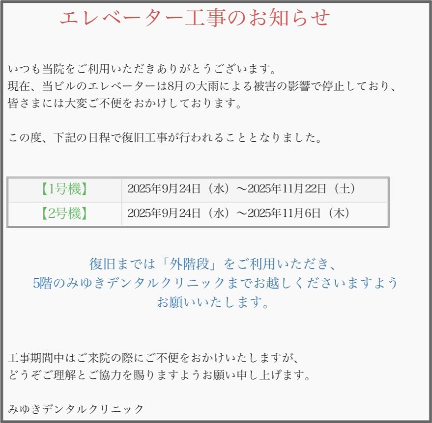 エレベーター故障のため、現在階段で5階まで上がっていただき、ご来院の皆様には大変ご迷惑をおかけしております。
